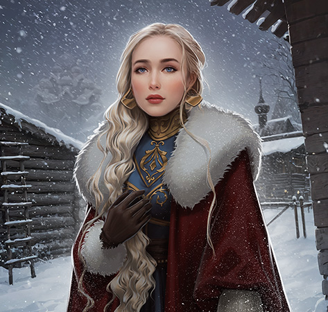 Среди заснеженных срубов, под тихий звон далёкого колокола, стоит северная княжна — белоликая, светловолосая, укутанная в алый бархат и тёплый мех. Снег ложится на её плечи, словно сама зима склоняется перед её достоинством. В её взгляде — и кротость, и несгибаемая сила рода, в сердце — верность древним заветам и холодная решимость. |
